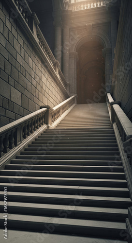 Obraz premium Majestic Grand Staircase Ascending Towards a Mysterious Illuminated Archway Bathed in Dramatic Light and Shadow