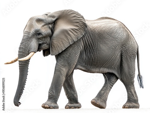 Obraz premium Majestic gray elephant, seen in profile, walking against a stark white...