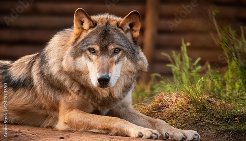 © netsay, Fototapeta premium Majestic Gray Wolf Captive Encounter A Portrait of Canis Lupus in Sandstone, Minnesota, Amidst Winters Twilight