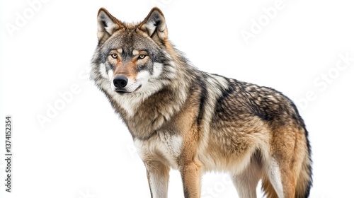 Fototapeta premium Majestic gray wolf close-up portrait on white background, looking directly ahead