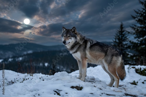 © Musfik, Fototapeta premium Majestic gray wolf in snowy mountains under full moon