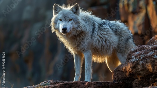 © peacehunter, Obraz premium Majestic Gray Wolf in Sunlight
