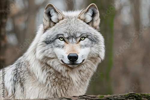 © Mokles, Obraz premium Majestic Gray Wolf Portrait in Forest Setting