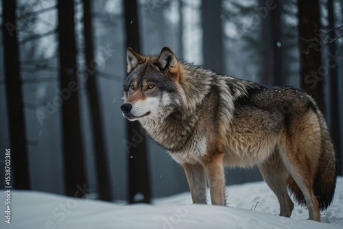 Fototapeta premium Majestic Gray Wolf Standing Alert in a Snowy Winter Forest