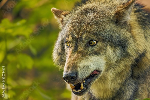 © Andreas Furil/Wirestock Creators, Fototapeta premium Majestic gray wolf stands atop a grassy hill overlooking a bush-lined landscape