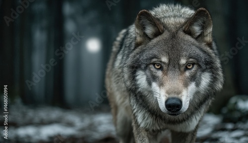© Raihan, Obraz premium Majestic gray wolf stares intently, a captivating portrait in a wintry forest.