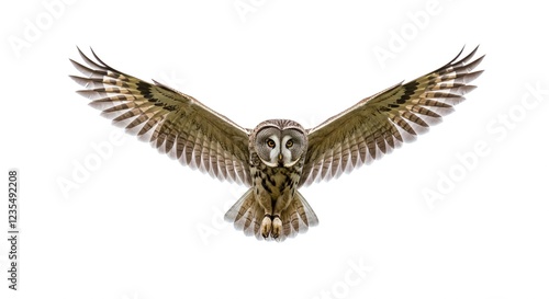© budi, Obraz premium Majestic Great Grey Owl in Flight Wings Spread Wide Isolated on White Background
