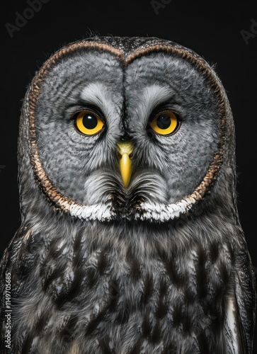 © Alfath, Obraz premium Majestic great grey owl portrait against black background.