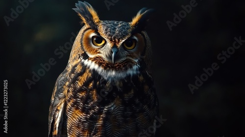 Fototapeta premium Majestic great horned owl in midnight forest with intense gaze