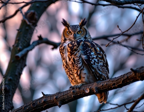 Obraz premium Majestic great horned owl perched on a sturdy oak branch, eyes gleaming in the twilight. Feathers ruffled slightly by a gentle breeze, wings, beak