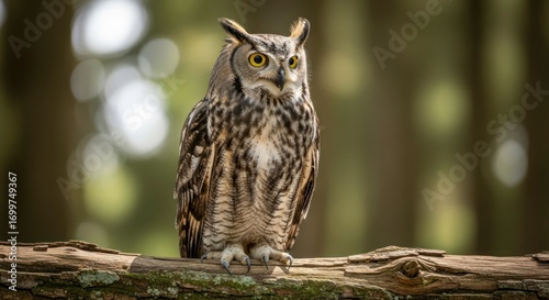 © Anak, Obraz premium Majestic Great Horned Owl Perched on Mossy Branch, Intense Yellow Eyes Gazing Forward