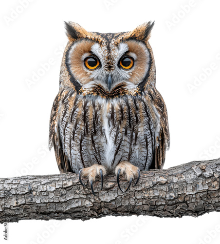 © Red X and Co, Naklejka premium Majestic Great Horned Owl Perched on Tree Branch with Piercing Yellow Eyes and Detailed Feather Pattern, Night Bird Portrait, Isolated on Transparent and White Background