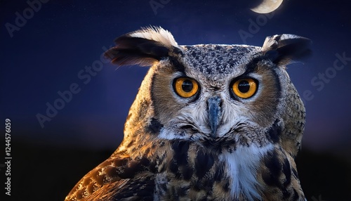 © netsay, Fototapeta premium Majestic Great Horned Owl Roosting Amidst the Moonlit Forest, Captured in a Moment of Enigmatic Serenity