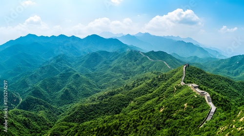 Naklejka premium Majestic Great Wall winds through lush green mountains