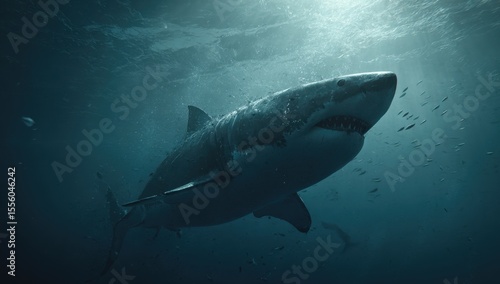 © AndyAziz, Naklejka premium Majestic Great White Shark Ascends from the Deep, a Shadowy Silhouette in the Ocean's Embrace.