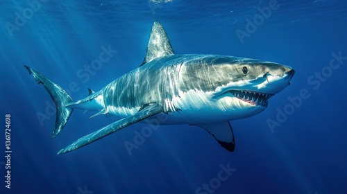 Naklejka premium Majestic great white shark breaches the deep blue, jaws agape. A thrilling...