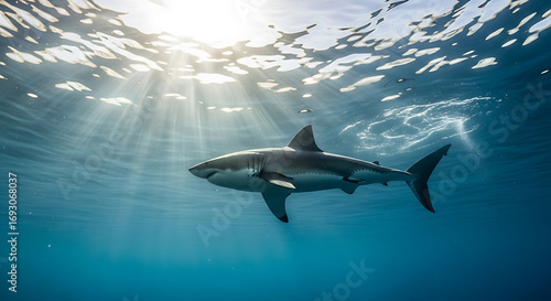 Fototapeta premium Majestic great white shark glides through sun-drenched ocean with visible sun rays