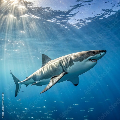Fototapeta premium Majestic great white shark in clear ocean waters.