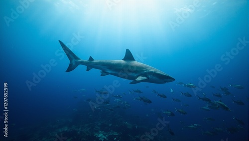 Fototapeta premium Majestic great white shark in deep blue ocean with schools of fish and sunlight rays