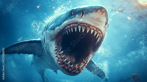 Fototapeta premium Majestic great white shark showcasing powerful jaws underwater