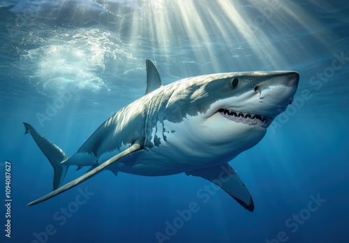 Fototapeta premium Majestic Great White Shark Swimming Gracefully Beneath the Ocean Surface with Sunlight Rays Illuminating the Vibrant Blue Waters of the Undersea World