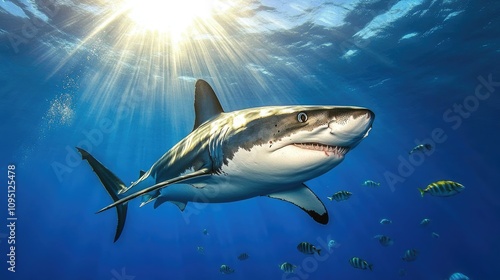 Fototapeta premium Majestic Great White Shark Swimming Gracefully in Crystal Clear Ocean Water Under Bright Sunlight with Vibrant Fish in the Background