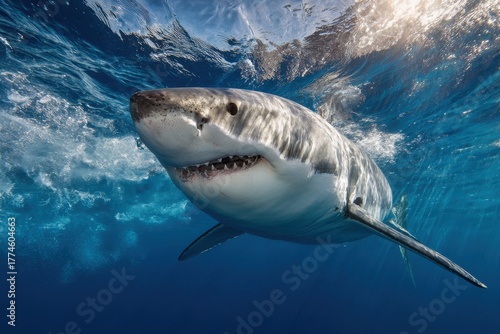 Naklejka premium Majestic great white shark swimming gracefully in crystal-clear waters, showcasing sharp teeth and an open mouth, while shimmering surface reflects captivating blue hues of the vibrant ocean