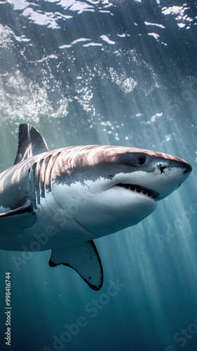 © Kiss, Naklejka premium Majestic Great White Shark Swimming Gracefully in Sunlit Ocean Waters