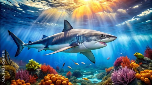 Obraz premium Majestic Great White Shark Swimming Gracefully Through Crystal Clear Ocean...