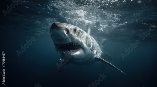 © Boonnam Burart, Fototapeta premium Majestic Great White Shark Swimming Gracefully Through the Ocean Depths Captured in Stunning Detail and Clarity