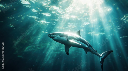 Naklejka premium Majestic Great White Shark Swimming in Crystal Clear Waters with Striking Sunlight Breaking Through Ocean Surface