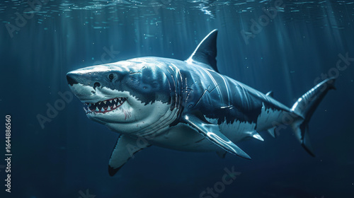Fototapeta premium Majestic great white shark swimming in deep blue ocean water with sunlight rays