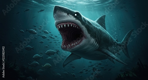 Naklejka premium Majestic Great White Shark Swimming in Deep Ocean with Schools of Fish