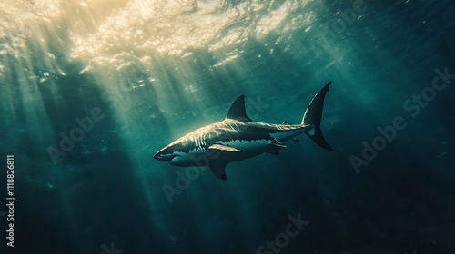 Fototapeta premium Majestic great white shark swimming in sunlit ocean depths.