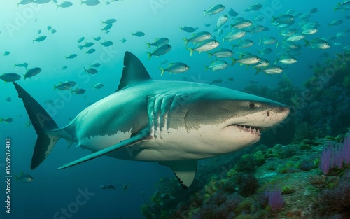 Naklejka premium Majestic Great White Shark Swimming Near Reef with School of Fish