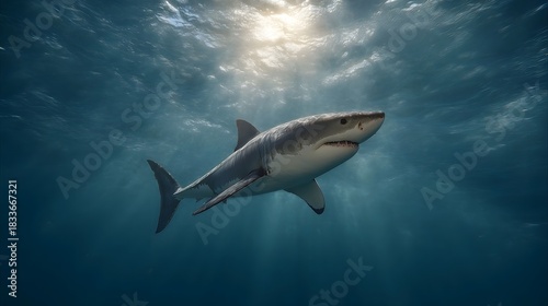 Naklejka premium Majestic great white shark swims gracefully underwater with sun rays illuminating the blue ocean