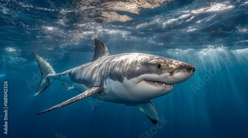 Naklejka premium Majestic great white shark swims powerfully beneath the shimme surface of the deep blue ocean waters now.
