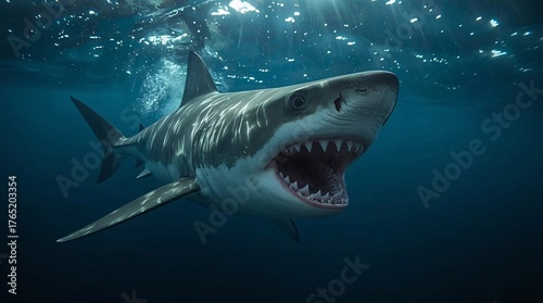© Hamza, Fototapeta premium Majestic great white shark with open jaws glides through deep blue ocean water, sunbeams piercing the surface