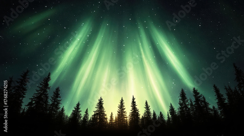 © siraphol, Fototapeta premium Majestic green aurora ribbons illuminate night sky above silhouetted trees, creating serene