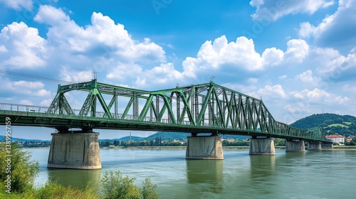 Naklejka premium Majestic Green Bridge Spanning the River under a Summer Sky
