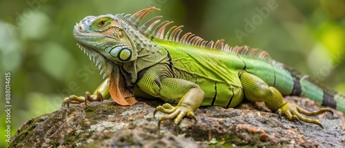 Fototapeta premium Majestic Green Iguana Basking on a Sunlit Rock in Lush Amazon Rainforest