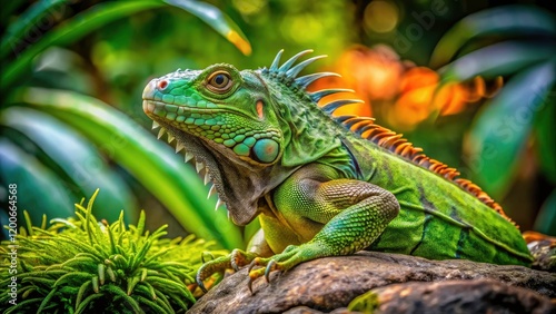 Obraz premium Majestic Green Iguana Resting on Rock in Natural Habitat - Serene Reptile...