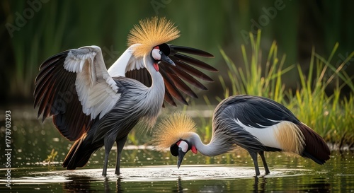 © photoplotnikov, Naklejka premium Majestic grey crowned cranes by water in lush wetlands