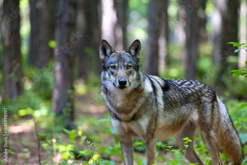 © Foysal, Naklejka premium Majestic grey wolf standing alert in a sun-dappled forest, observing its surroundings