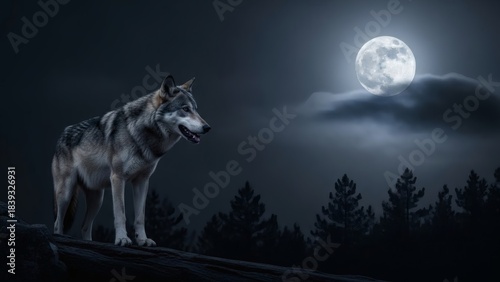 Naklejka premium Majestic grey wolf standing on a rock at night under a bright full moon and cloudy sky, symbolizing wilderness and the beauty of nature.