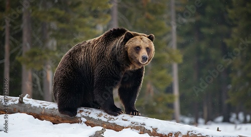 © Gina, Fototapeta premium Majestic Grizzly Bear Standing on Snowy Log in Winter Forest.