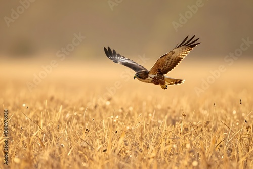 © OnuTH, Fototapeta premium Majestic Hawk Soaring Over Golden Field During Late Afternoon Light in Natural Landscape