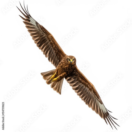 © Wiravan, Obraz premium Majestic Hawk Soaring with Outstretched Wings Against White Background