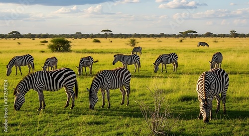 Fototapeta premium Majestic herd of zebras grazing peacefully in the golden savanna grasslands...