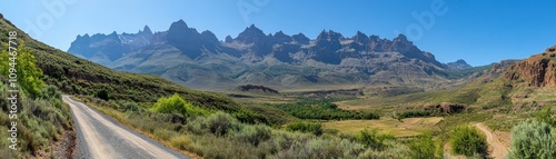 Naklejka premium Majestic High-altitude Peaks Rising Over Rugged Cliffs A Breathtaking Panorama of Serene Mountain Majesty, showcasing towering peaks against a vibrant blue sky Discover the awe-inspiring beauty of